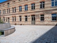 A classic brick wall in Berlin, Germany. The open courtyard in front of a historic building showcases the city's classic architecture. The clear sky frames the urban design of this European city.