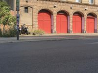 A classic architecture building in Berlin, Germany, with tints and shades of the vibrant city. A man stands in front of the building as a motorcycle drives by on the asphalt road. The urban scenery blends with the surrounding vegetation.