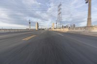 A classic architectural bridge in the city at dawn. The straight road lined with asphalt leads to a bustling urban scene. Clouds create a dramatic backdrop for the motion blur on the road. A perfect representation of city life at the break of day.