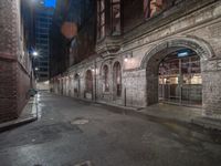 A classic architecture building with a brick wall and street lights illuminating the dark night. The restaurant's windows light up the street, creating a cozy atmosphere. A perfect spot to eat out and enjoy the city.