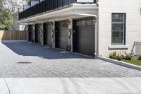 This is an image of a classic residential building in Toronto, Ontario, Canada. The beautiful architecture of the house is highlighted by the well-maintained asphalt road and concrete driveway leading up to the property. The image captures a sunny day, showcasing the blue sky and the lush greenery in the neighborhood. In the foreground, a parking garage can be seen, along with neatly lined curbs and doorways of other houses. This photo represents the charm and elegance of the residential areas in Toronto.