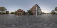 A fish-eye view of two classic architecture buildings in the bustling city of Los Angeles, California. Cobblestone streets and clear skies create a vibrant atmosphere. The perfect place for shopping, dining, and exploring the city.