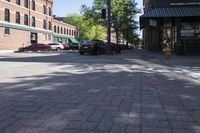 A view of a classic architecture in downtown Denver, Colorado. The low, hard shadows cast by buildings create a dramatic urban scene. Pedestrians cross the cobblestone street while vehicles navigate the asphalt road.