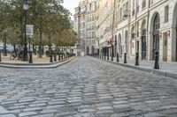 This is an image of a classic architecture in Paris, France. The photo was taken at dawn, capturing the break of day in the city. The straight road and cobblestone surface lead through the neighborhood, lined with trees. The urban design and architecture reflect the charm and beauty of Paris. This photo represents the vibrant city life and the unique atmosphere of a European city. The image showcases the public spaces and curbs, illustrating the essence of human settlement in Paris.