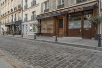 This is an image of a quiet street in Paris, France at dawn. The classic architecture of the buildings creates a charming atmosphere in this mixed-use neighborhood. The empty street is lined with cafes and restaurants, with their wooden doors and lots of windows inviting passersby. Cobblestone and tiled road surface adds to the allure of this historic area. This photo represents the beauty of city life and urban design in Paris.