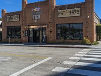 A view of an empty road by an old building with storefront signs in windows and an intersection in front of the store. This classic architecture is located in Los Angeles, California, USA. The property is situated in a vibrant city neighborhood, surrounded by urban infrastructure and surrounded by residential areas. The road surface is made of smooth asphalt, while the vegetation and clear sky add to the picturesque scenery. This real estate, with its brick facade and brick walls, stands out among the neighboring buildings. A crosswalk or zebra crossing can be seen in front of the building, making it easily accessible for pedestrians. The area also includes restaurants, providing an opportunity to eat out in this bustling city.