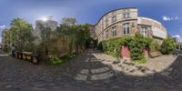 a fisheye lens view of buildings, bushes, and trash cans on a cobble - stone street