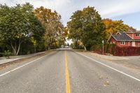 A scenic view of a classic architecture residential area in Kelowna, British Columbia, Canada. The straight road leads through the colorful autumn trees of the Okanagan Valley. Clouds dot the sky, adding to the charm of this suburban landscape.