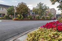 This image showcases the classic architecture and residential buildings of a suburban neighborhood in Ontario, Canada. The view captures a gloomy autumn day with a grey sky overhead. The foreground features a road surface flanked by trees and vegetation, adding a touch of color with magenta flowers. The charming windows and shrubs of the houses create a picturesque scene. The photo represents the real estate and serene ambiance of this suburban area. This is the perfect image to depict the beauty of a tranquil neighborhood in Toronto or Niagara.