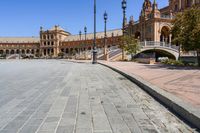 This stunning stock photo showcases the timeless beauty of Seville, Spain. A very large building, reminiscent of classic architecture, stands proudly on Plaza de España. The sky is clear, and the surrounding nature adds to the charm of this vibrant city. A road in front of the building leads the way to other architectural wonders. Explore the town square, enjoy recreational activities, and immerse yourself in the rich history and culture of this captivating human settlement. Don't miss the opportunity to visit museums and experience the beauty of this remarkable public space.
