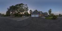 Classic architecture of a suburban home in the USA. The circular image captures the sunset, casting a warm glow on the old house and surrounding open space. A straight road leads to the driveway and parking lot.