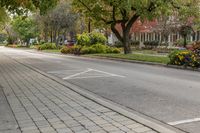 A view of a residential neighborhood in Ontario, Canada. Classic architecture with windows, branches, and leaves adds to the charm. Grey sky and gloomy atmosphere give an autumn feel. Streets lined with trees and curbs create a serene suburban scene.