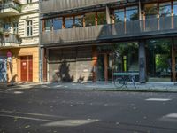 A classic Berlin street scene featuring modern and classic architecture casting hard shadows. Urban design elements blend with residential buildings, showcasing city life in Europe.