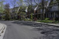 A straight road in Toronto, Ontario extends into the distance, lined with classic residential buildings and trees. The clear sky above complements the timeless architecture. A perfect day for a stroll.