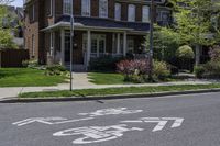 a house with a bike lane sign on a sidewalk in front of it at a residential neighborhood