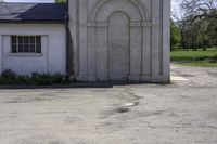 a white concrete building with an arched doorway and a door with columns in the front