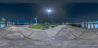A stunning view of a park bench and lights near the water on a clear night in Holland, Netherlands. The cityscape reflects on the calm lake, creating a picturesque atmosphere. The high-rise buildings and skyscrapers form a beautiful profile against the dark sky.