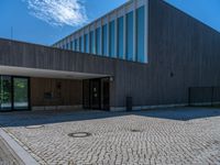 Berlin's urban landscape with clear skies. Modern architecture casting hard shadows on cobblestone streets. An open space in Germany's capital city showcases a blend of historic and modern urban design.