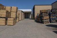 a large garage filled with lots of boxes and crates of hay stacked up to the side