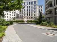 This stock photo showcases the beauty of Berlin, Germany with its modern architecture and clear sky. The image captures a paved street and trees in a large city area, with a stunning statue in the center. The residential buildings along the road exhibit contemporary design with their stylish windows and infrastructure. The well-maintained road surface, green grass, and lush vegetation enhance the overall charm of this residential area. The cobble stone detailing adds a touch of elegance to the urban design. With a clear sky as the backdrop, this image highlights the vibrant city life and harmonious urban surroundings of Berlin, Germany, making it a perfect choice for projects related to architecture, city living, and Europe.