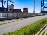 Bremerhafen's industrial skyline in Europe's largest container port. Clear skies showcase the urban design of the city. Asphalt roads lead to the busy pier and harbor, where cranes and container ships roll in.
