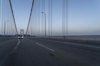 This is an image of a suspension bridge at dawn. The bridge is a magnificent piece of architecture, with its blue structure spanning across the horizon. The road surface, made of asphalt, stretches into the distance. The motion blur suggests the movement of vehicles on the bridge, indicating its role as a key mode of transport. The clear sky in the background enhances the beautiful silhouette of the bridge. This photo captures the break of day and showcases the infrastructure and beauty of this suspension bridge.