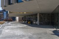 This image captures the back of a yellow fire hydrant near the entrance to a modern office building in Ottawa, Canada. The building features large glass windows that reflect the clear sky above. The urban architectural design of the business district is showcased through the use of concrete and composite materials in the construction of the building and the surrounding surfaces. The photo represents a typical day in the city, where urban life and business thrive. The shade from nearby buildings adds depth and contrast to the scene.