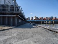 This is a photo taken straight down a road in Bremen, Germany. The urban design of towering buildings and industrial factories can be seen along the road surface. A clear sky hangs above the city, reflecting in the ocean waters near the coastal area. In the distance, a container port and jetty are visible, and boats are lined up along the pier. This image captures the bustling city life and the industrial activities happening in Bremen's harbor.