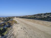 This image showcases a scenic landscape in Portugal, Europe. The photo captures a dirt road that cuts through the sandy beach and leads towards the ocean. In the foreground, there is a small patch of vegetation, adding a touch of green to the coastal scenery. The clear sky and the horizon create a sense of openness and vastness. This photo represents a beautiful day at the beach in Portugal, where nature meets the coastline.