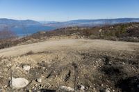 This image captures the breathtaking landscape of British Columbia, Canada. The highland mountain range and coastal cliffs create a rugged and elevated terrain. The clear sky above frames the summit, showcasing the natural beauty of this region. The dirt track and gravel road wind through the highlands, providing an off-road adventure for nature enthusiasts. In the foreground, the profile of the hill and chaparral create a picturesque scene. This photo represents the stunning Okanagan Valley near Kelowna, showcasing the diverse mountain landforms and reservoirs in the area.