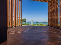 This image captures the beautiful coastal architecture of Hong Kong against a clear sky. The open space features a wood floor with hard shadows, adding depth and texture to the scene. The coastline is visible in the background, with the ocean's sparkling water reflecting the sunlight. This photo represents a typical day in Hong Kong, showcasing the unique blend of modern architecture and natural coastal beauty that the city has to offer.