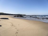 This stock photo showcases the stunning coastal landscape of Portugal. The photo captures a beautiful sandy beach with clear sky above. The coastline stretches along the open space, creating a serene and tranquil atmosphere. The clear water gently kisses the shore, as the waves rhythmically lap against the rocks. This scene is a perfect depiction of the natural beauty and serenity found in Europe's coastal regions.