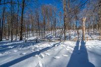 This image captures the rural scenery of Ontario, Canada. The clear sky provides a backdrop for the tall, bare trees that cast a shadow on the snowy field. The road meandering through the landscape emphasizes the tranquility of the area. This photo represents a typical winter day in Ontario, with the snowy field and trees creating a serene and peaceful atmosphere.