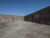 A symmetrical landscape with a clear sky and open space. Concrete and asphalt road surfaces create a rectangular fixture. The sun shines brightly on this day, highlighting the smooth and sturdy composite materials used for the road.