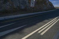 A road cutting through the desert landscape of South Africa. The asphalt thoroughfare stretches into the distance, parallel to a rocky slope. Clear skies and a grey rock wall complete the picturesque scene.