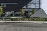 This image captures the modern urban design and architecture of the financial district in Toronto, Canada. The photo shows a building surrounded by vegetation on both sides, creating a vibrant and green environment in the midst of the city. A bus is seen driving down the road in front, representing the bustling city life of Toronto. The grey-colored building stands out against the clear blue sky, and the asphalt road surface adds to the urban feel of the scene. This photo showcases the blend of nature and urbanism in the vibrant city of Toronto.