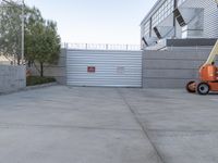 a concrete area with a crane in the middle of it and a building with a gate on the wall behind