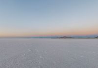 A breathtaking landscape at dawn in the Salt Lake desert. The clear sky contrasts with the footprints of people in the snow. Open space and the mountains in the distance create a tranquil atmosphere.