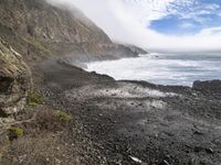 A rugged coastal landscape in California along the Pacific Coast Highway. The grey sky hovers over the rocky shore, while waves crash against the cliffs. An off-road track leads to a dirt road, hinting at recreational activities in the area.