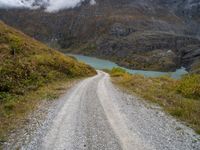 This image showcases a gloomy day in the highlands of Austria. The grey sky contrasts with the rugged landscape, featuring mountains, lakes, and vegetation. A straight road leads through the mountainous terrain, surrounded by grass, gravel, and dirt. The road surface is rough and off-road, reflecting the challenging nature of the area. This photo captures the atmosphere of a gloomy day in Europe's highlands, inviting viewers to imagine the adventure and beauty that awaits amidst the mist and clouds.