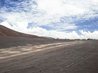 a man walking on a road with some gravel and some clouds in the sky and hills