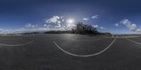 the sun is shining above the clouds in a sunny day from a circular lens at the side of the asphalt