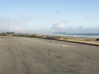 This image captures an atmospheric scene in California, USA. The photo shows an empty road near the coastal area, with a fence and sand in the background. The fog creates a gloomy and grey sky, adding to the mood of the scene. In the distance, the ocean and sea can be seen through the mist. The clear sky above contrasts with the low clouds and contrails, creating an interesting visual contrast. This photo represents a peaceful day by the beach, with a serene and tranquil atmosphere.