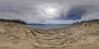 a panoramic view of a beach with cliffs and sea in the background, from a low angle