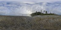 a view of the beach at low tide with rocks, trees and a sky background