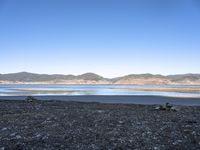 some animals on the beach next to mountains and water and land in the background,