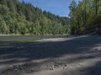 This image captures a stunning coastal landscape with a straight road leading to a high mountain in the distance. The road surface is a mix of gravel and asphalt, with vegetation lining both sides. The open space and beach provide a serene view of the ocean and the lake beyond. A few trees and hills add to the natural beauty of this scene. The clear sky is adorned with fluffy clouds. The hard shadows cast by the trees create a striking contrast. Overall, this photo showcases the diverse landscape and water resources of this coastal region.