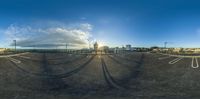 A low coastal city in Australia at dawn, with a large parking lot near docks. Urban infrastructure includes a road, boardwalk, and pier. Clouds in the sky and the rising sun create a picturesque scene.