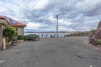 A gloomy dawn on the coastal city. Grey sky reflects on open space with picnic table and bench near the lake. Power poles and street lights illuminate the road and pier leading to the restaurant.