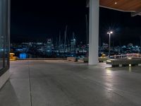 a large concrete deck with benches and a view of the city lights in the background